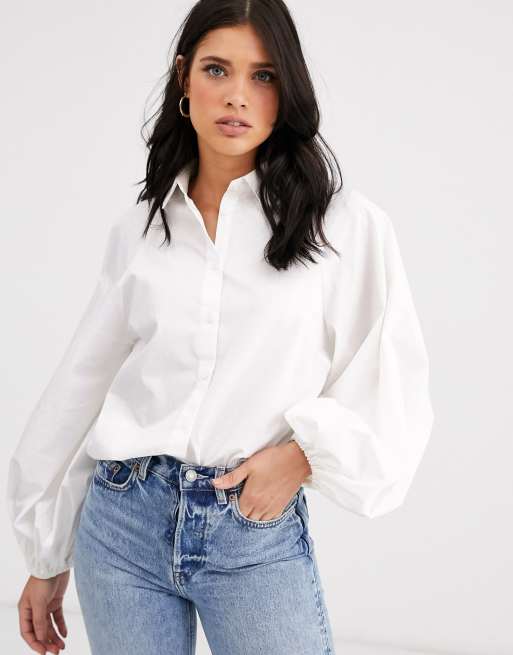 Asos Design Long Volume Sleeve Shirt In Cotton In White Asos